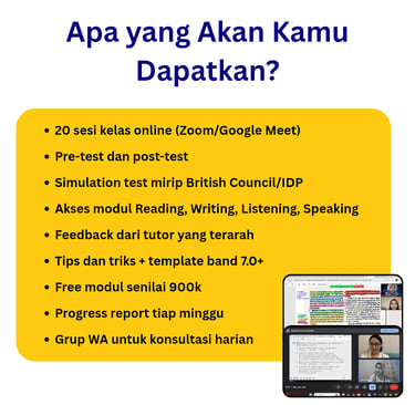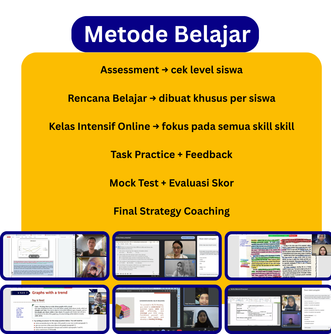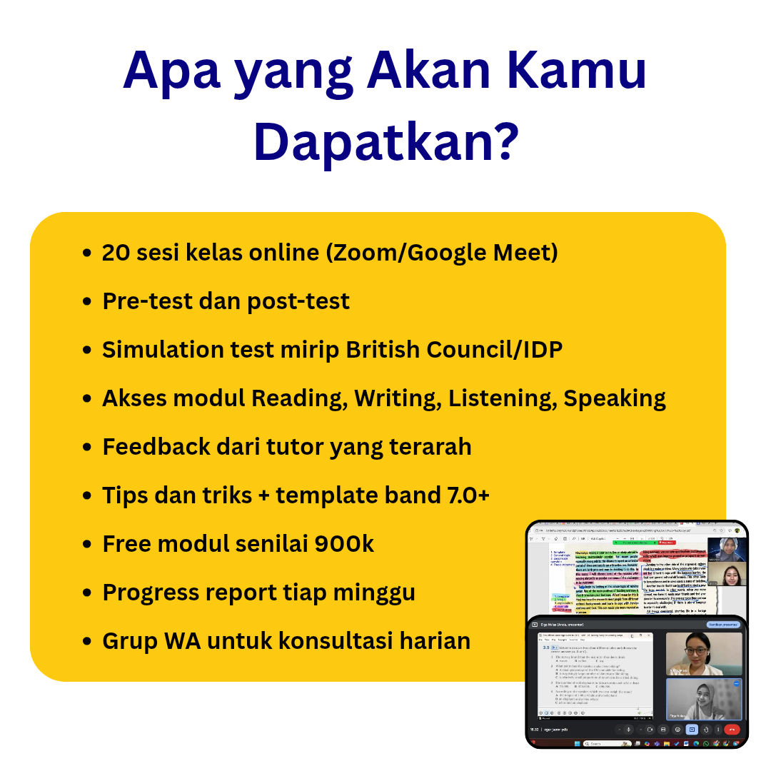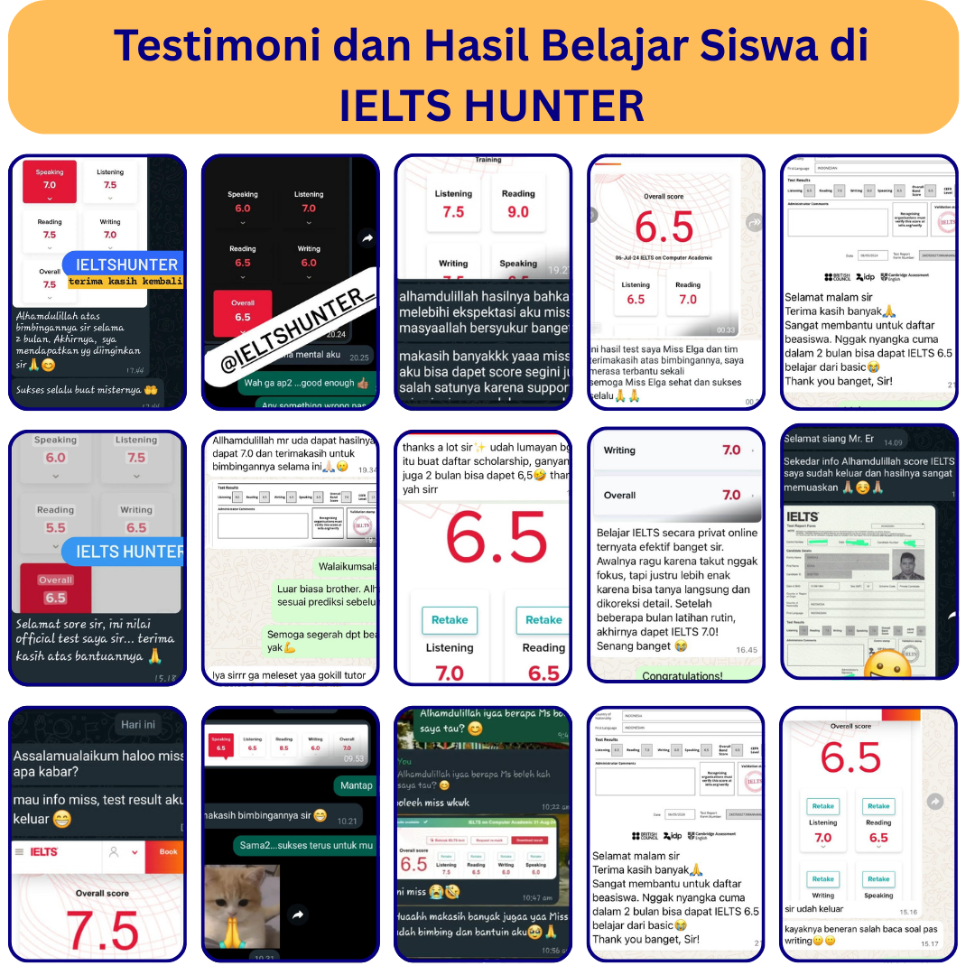 Didukung oleh mentor berpengalaman, modul yang terstruktur, dan evaluasi rutin setiap sesi, IELTS Hunter tumbuh sebagai pilihan utama bagi mahasiswa, pekerja profesional, dan pemula yang ingin mendapatkan hasil maksimal dalam waktu yang efisien.